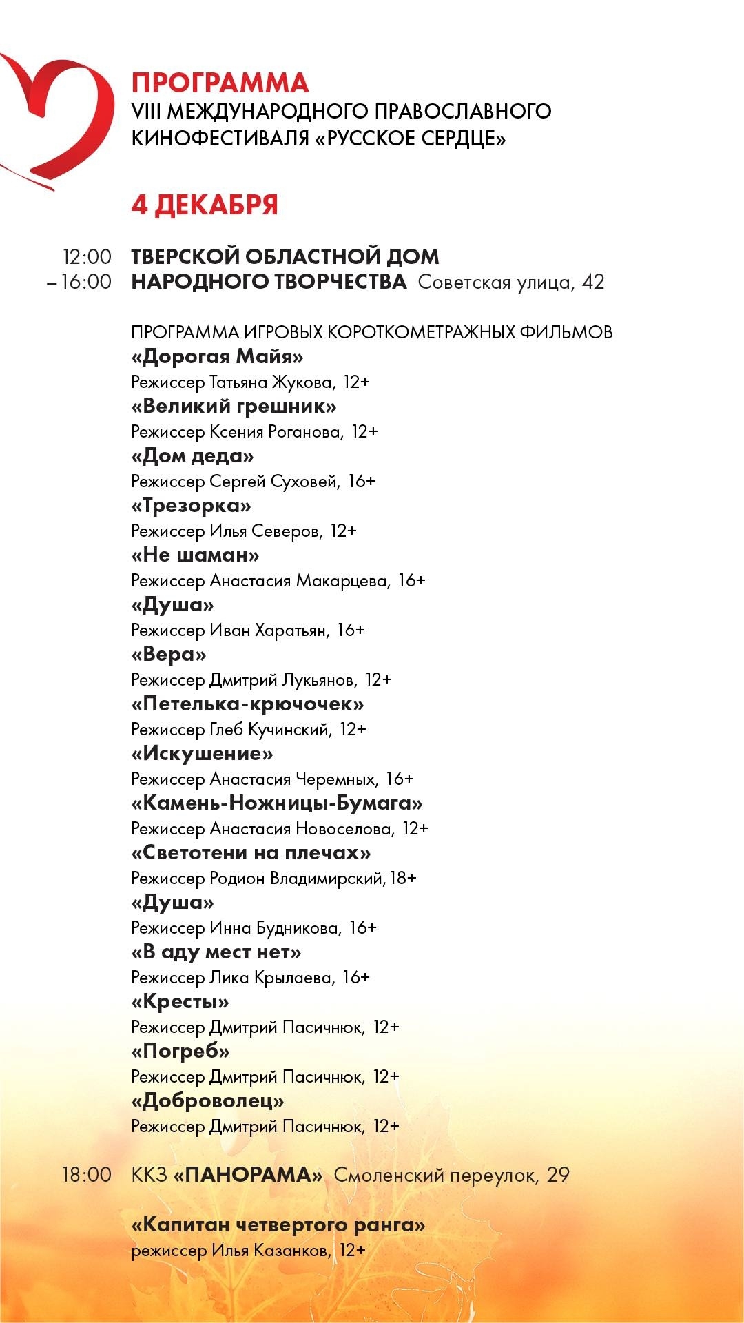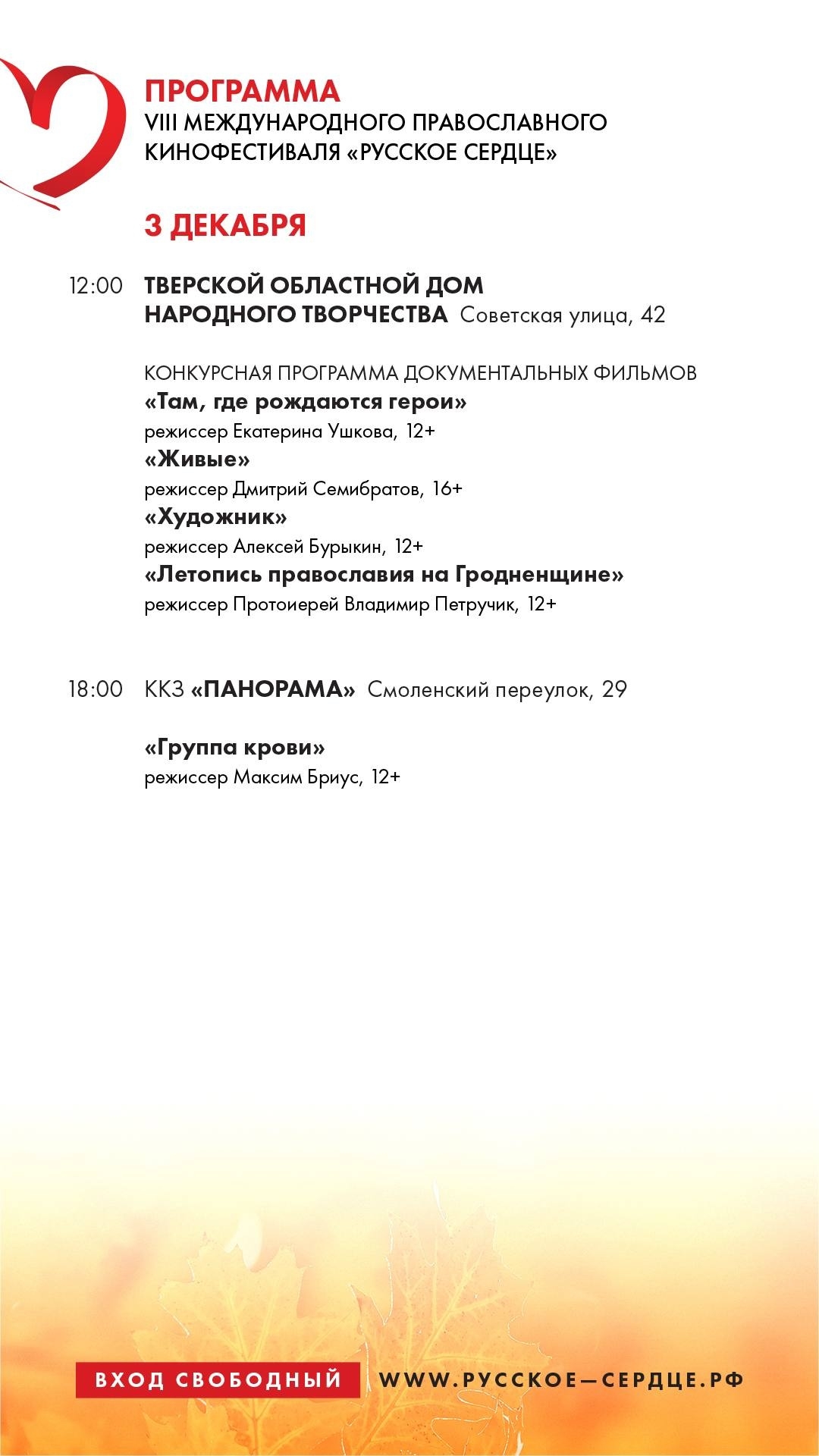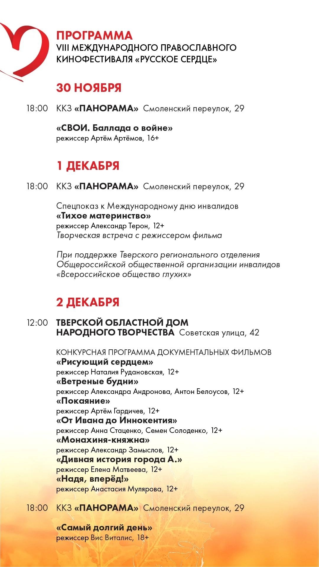 Конкурсная программа этого года включает в себя игровые полнометражные фильмы, игровые короткометражные фильмы, неигровые фильмы и детскую анимационную программу. Ознакомиться с программой кинофестиваля можно на сайте www.русское-сердце.рф, а для общения со зрителями активно развиваются страницы «Русского сердце» ВКонтакте и телеграм-канал.
