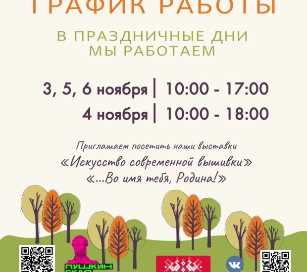 В праздничные дни Музейно-выставочный центр им. Л. Чайкиной Тверского областного Дома народного творчества работает: 3, 5, 6 ноября — с…