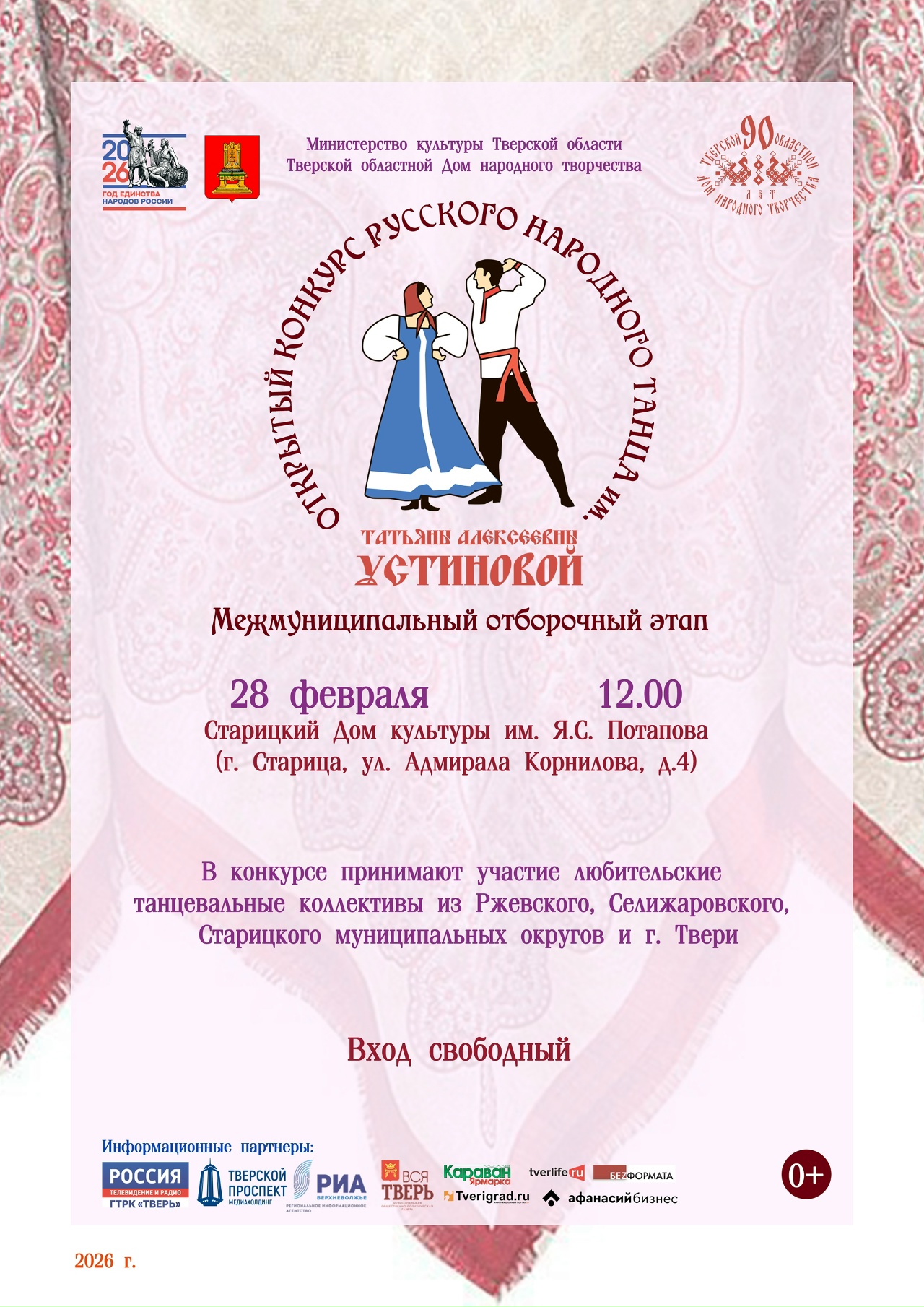 28 февраля в Старицком муниципальном округе пройдет межмуниципальный отборочный этап XX открытого конкурса русского народного танца им. Т.А. Устиновой.