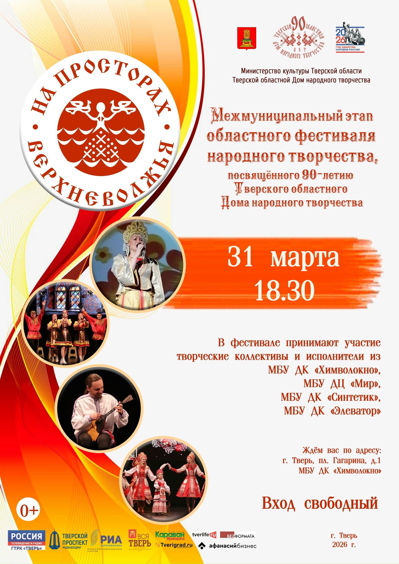 31 марта в 18.30 во Дворце культуры » Химволокно» (г. Тверь) Тверской областной Дом народного творчества проводит межмуниципальный этап областного фестиваля народного творчества «На просторах Верхневолжья» в рамках Года единства народов России и 90-летия Тверского областного Дома народного творчества Тверской областной Дом народного творчества.