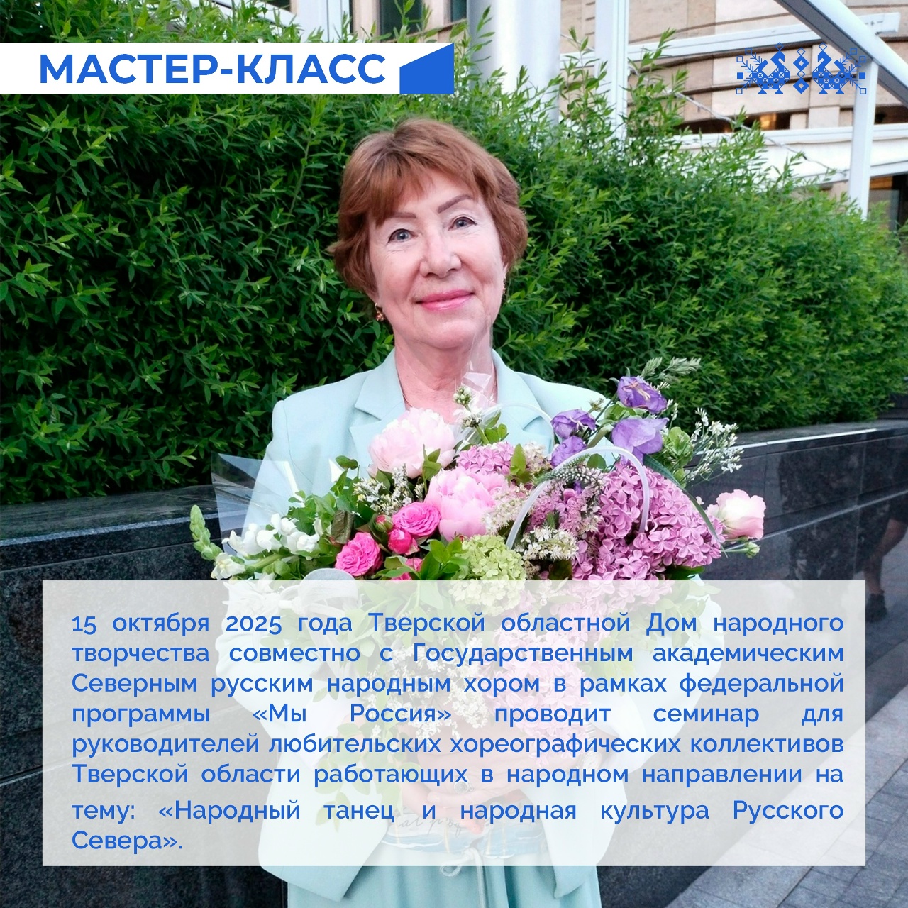 15 октября 2025 года Тверской областной Дом народного творчества совместно с Государственным академическим Северным русским народным хором в рамках федеральной программы «Мы Россия» проводит семинар для руководителей любительских хореографических коллективов Тверской области работающих в народном направлении на тему: «Народный танец и народная культура Русского Севера».