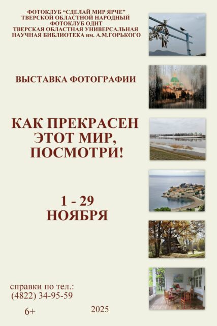 Тверской областной народный фотоклуб Тверского областного Дома народного творчества проводит фотовыставку «Как прекрасен этот мир, посмотри!», которая посвящается девятой годовщине создания фотоклуба «Сделай мир ярче»