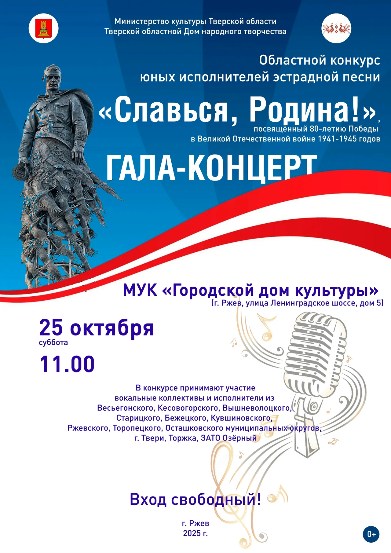 25 октября 2025 года в 11.00 Тверской областной Дом народного творчества проводит финал областного конкурса юных исполнителей эстрадной песни «Славься, Родина!» в Городском Доме культуры Ржевского муниципального округа, который объединит лучших вокалистов и коллективы нашего региона!