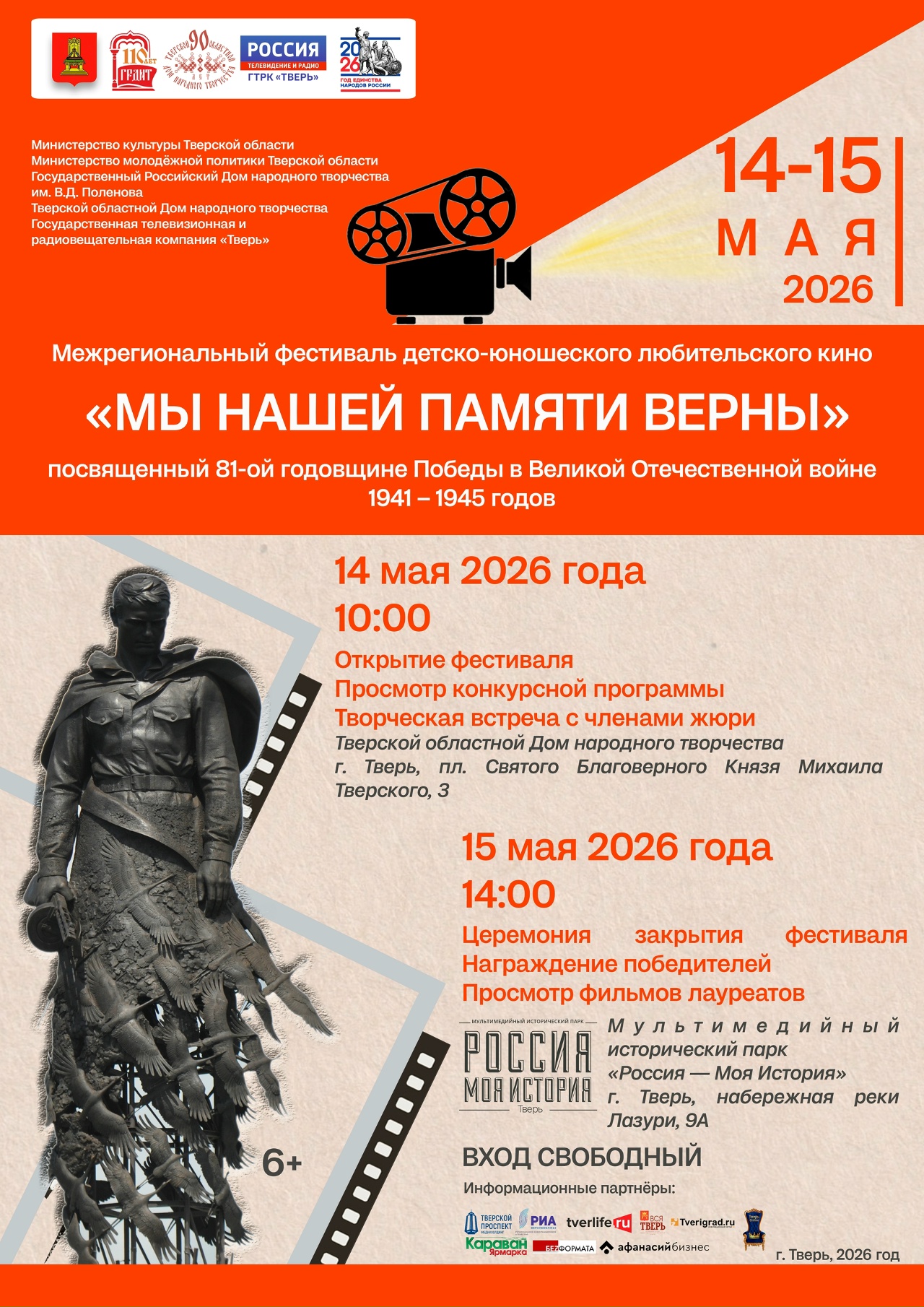 14-15 мая 2026 года Тверской областной Дом народного творчества при содействии Государственного Российского Дома народного творчества имени В.Д. Поленова, Министерства молодежной политики Тверской области, Государственной телевизионной и радиовещательной компании «Тверь» проводит VIII Межрегиональный фестиваль детско-юношеского любительского кино «Мы нашей памяти верны», посвященный Победе в Великой Отечественной войне 1941 – 1945 годов.
