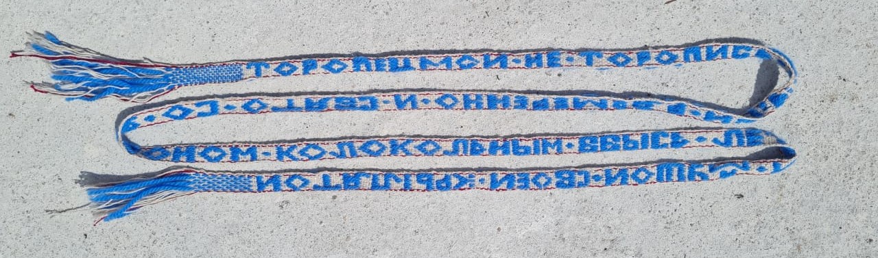 Такие пояса иногда включали имя девушки-мастерицы: «Агафья Степанова пояс ткала» или принадлежность: «Анна Василиста Петровна деревни Медведицы».