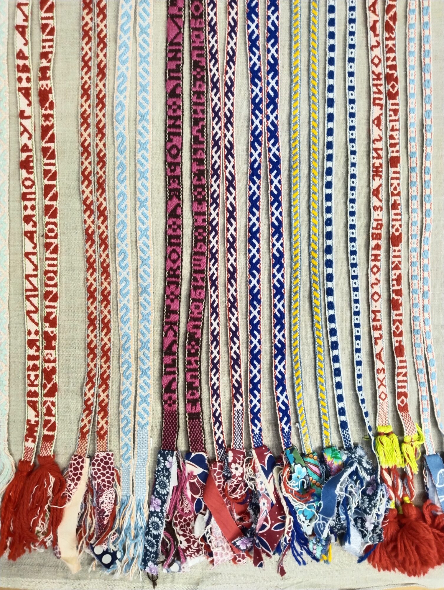 Не всегда ткачиха была грамотна, поэтому на поясах встречаются перевёрнутые буквы, буквы в зеркальном изображении, слившиеся вместе слова и др. А иногда набор букв. В таком случае слова, при всех своих смысловых значениях, как и набор букв, остаются формой орнамента, украшением утилитарного изделия.
