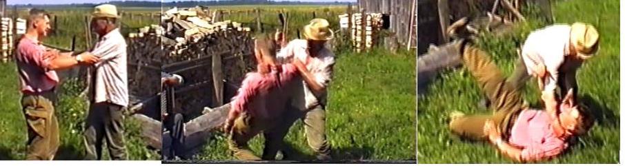 2. Бросок «пень корчевать». Вращение (после пропущенного удара, согнувшегося) противника на его стопах и потом толчок от себя.