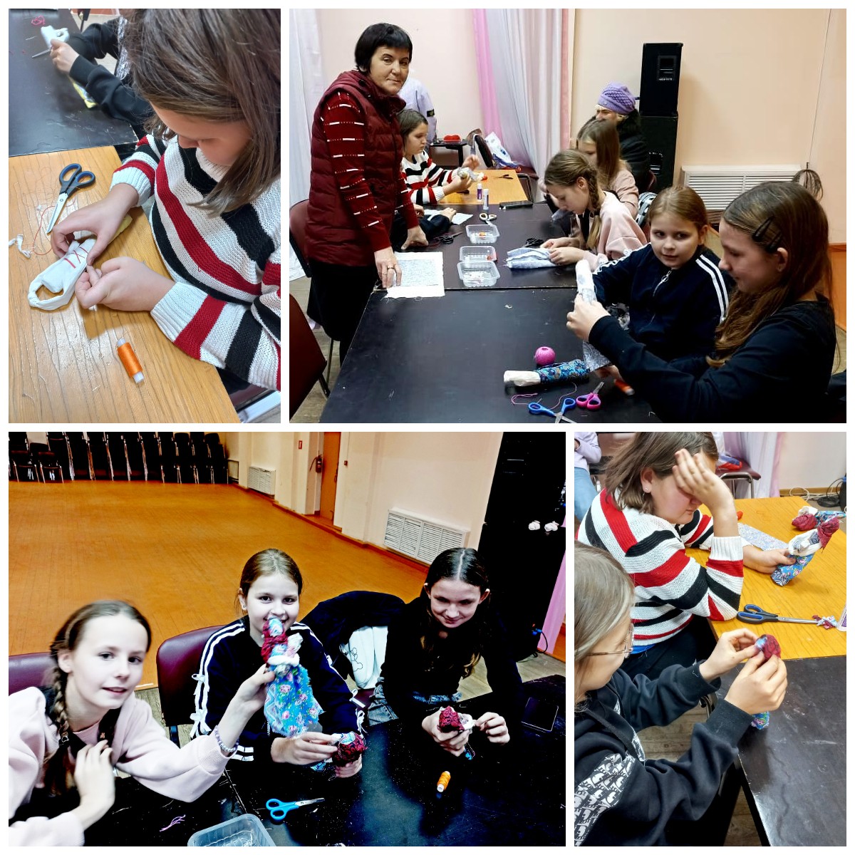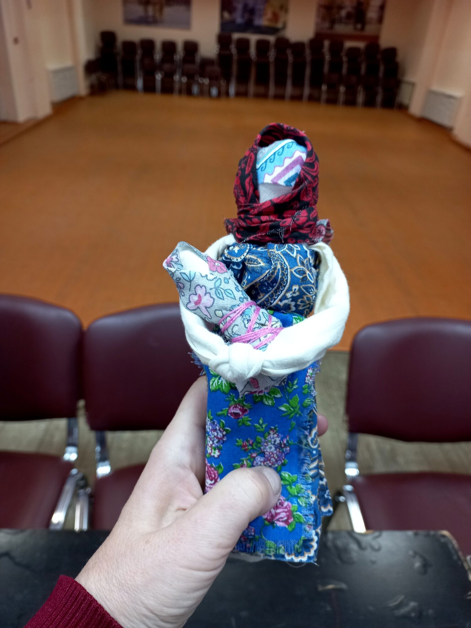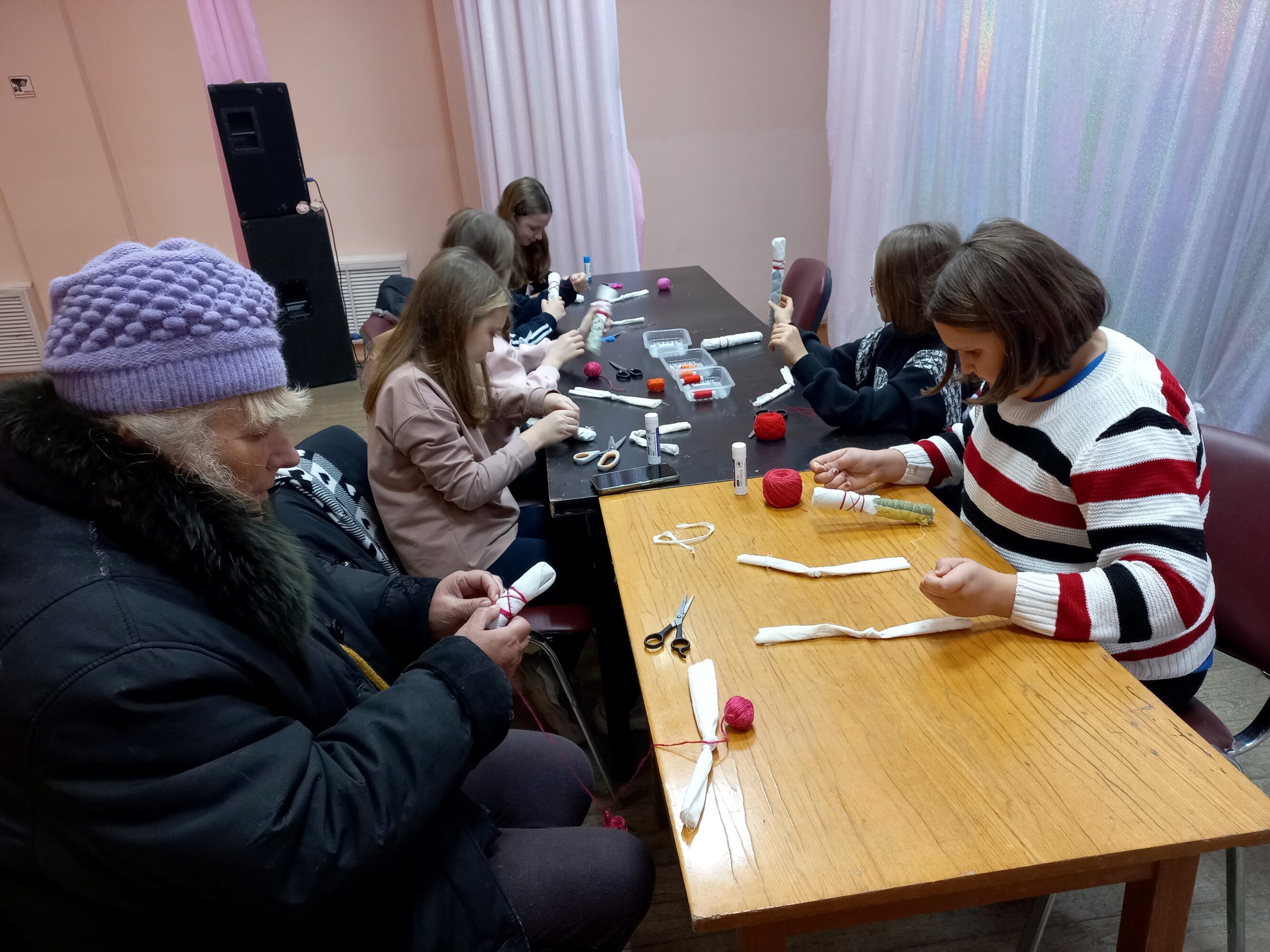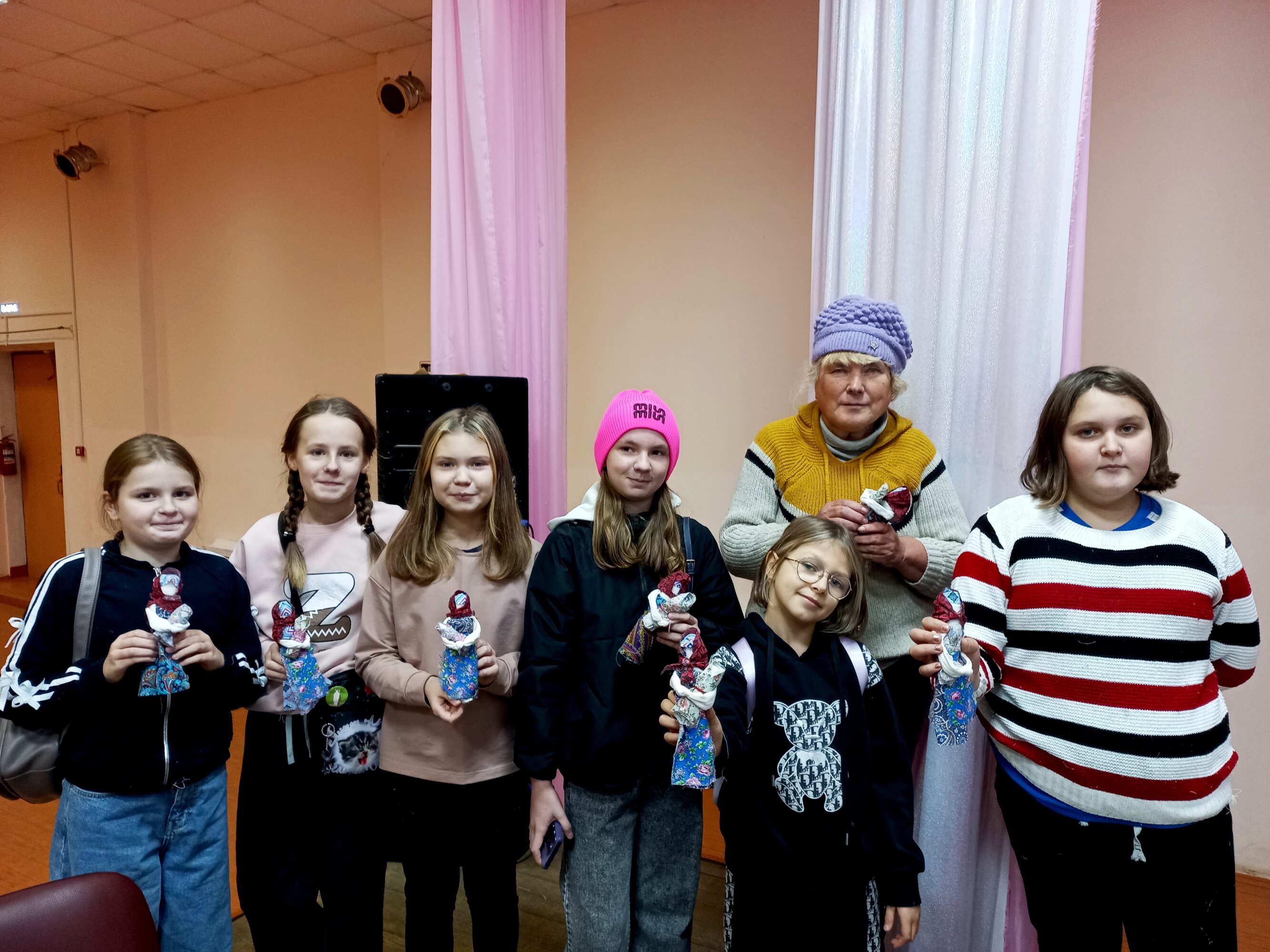 После беседы о древней традиции изготовления народных кукол, разнообразии их видов, техник изготовления участники вместе с заведующим сектором С. Мироновой изготовили из цветных лоскутков обережную куклу-столбушку «Мамушка» (символ плодородия, любви матери-прародительницы к новым поколениям, защиты рода).