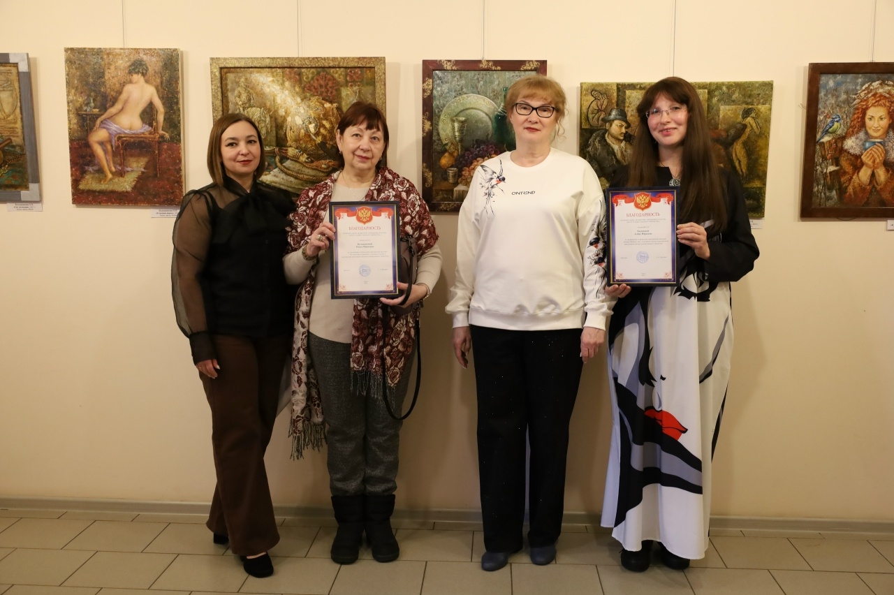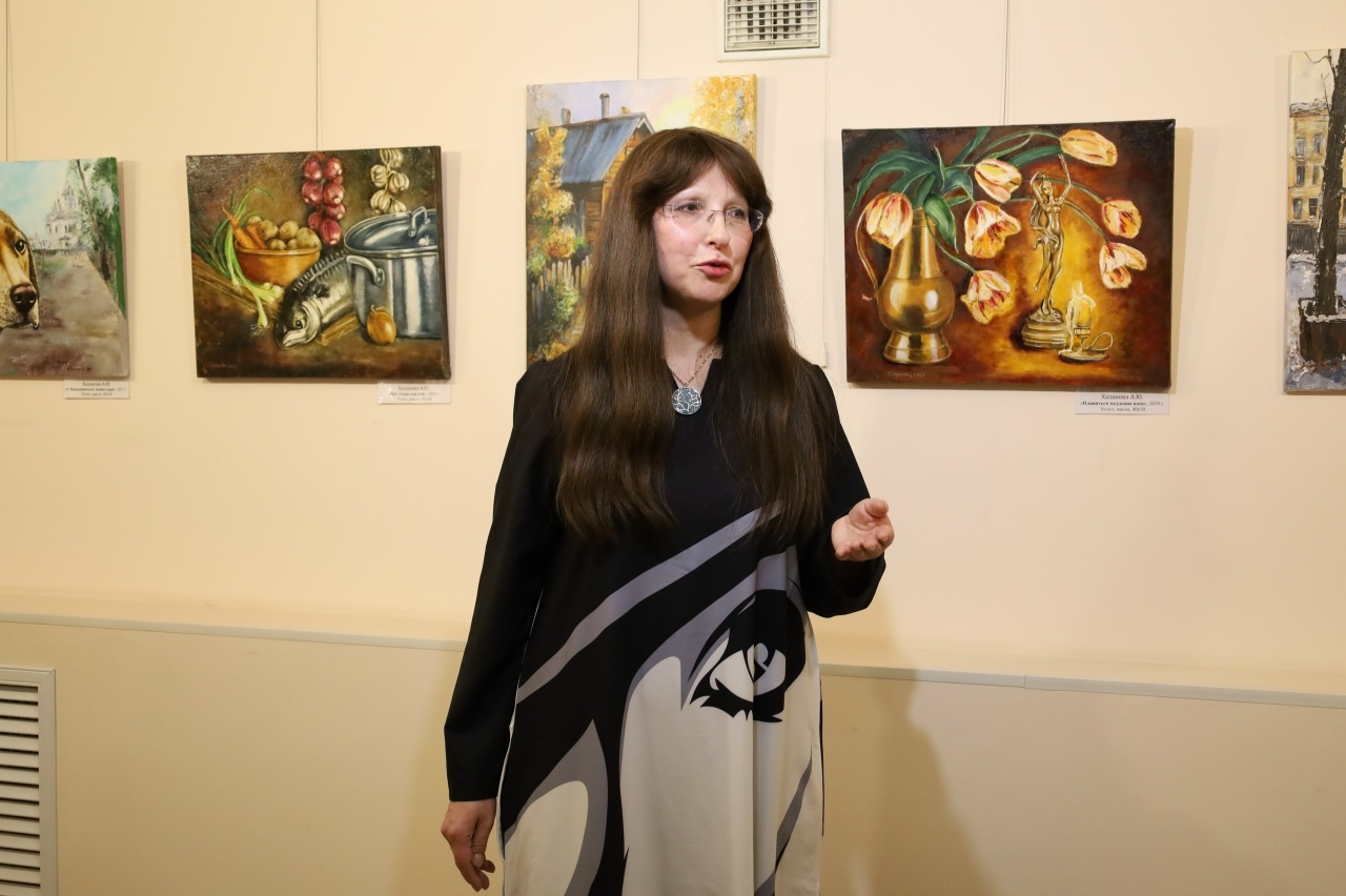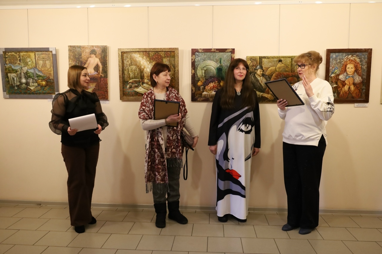 Сегодня в уютном Выставочном зале Центра художественного творчества состоялось открытие персональной выставки художника Ольги Большаковой «Путешествие во времени» и персональной выставки художника Алены Хазановой «Ритмы обычного дня». Не смотря на индивидуальный путь в искусстве, у художниц есть общие составляющие творчества, которые их объединяют – смелость, любовь к экспериментам и преданность искусству. В ходе открытия состоялся творческий диалог, из которого гости выставок смогли больше узнать об авторах. Ольга Павловна Большакова рассказала о своём пути в изобразительном искусстве, о вдохновении, черпаемом из работ старых мастеров, и о том, как исторические эпохи влияют на её творчество. Художница рассказала о своей любви к масляной живописи и о том, как она стремится соединить элементы прошлого и настоящего в своих работах.