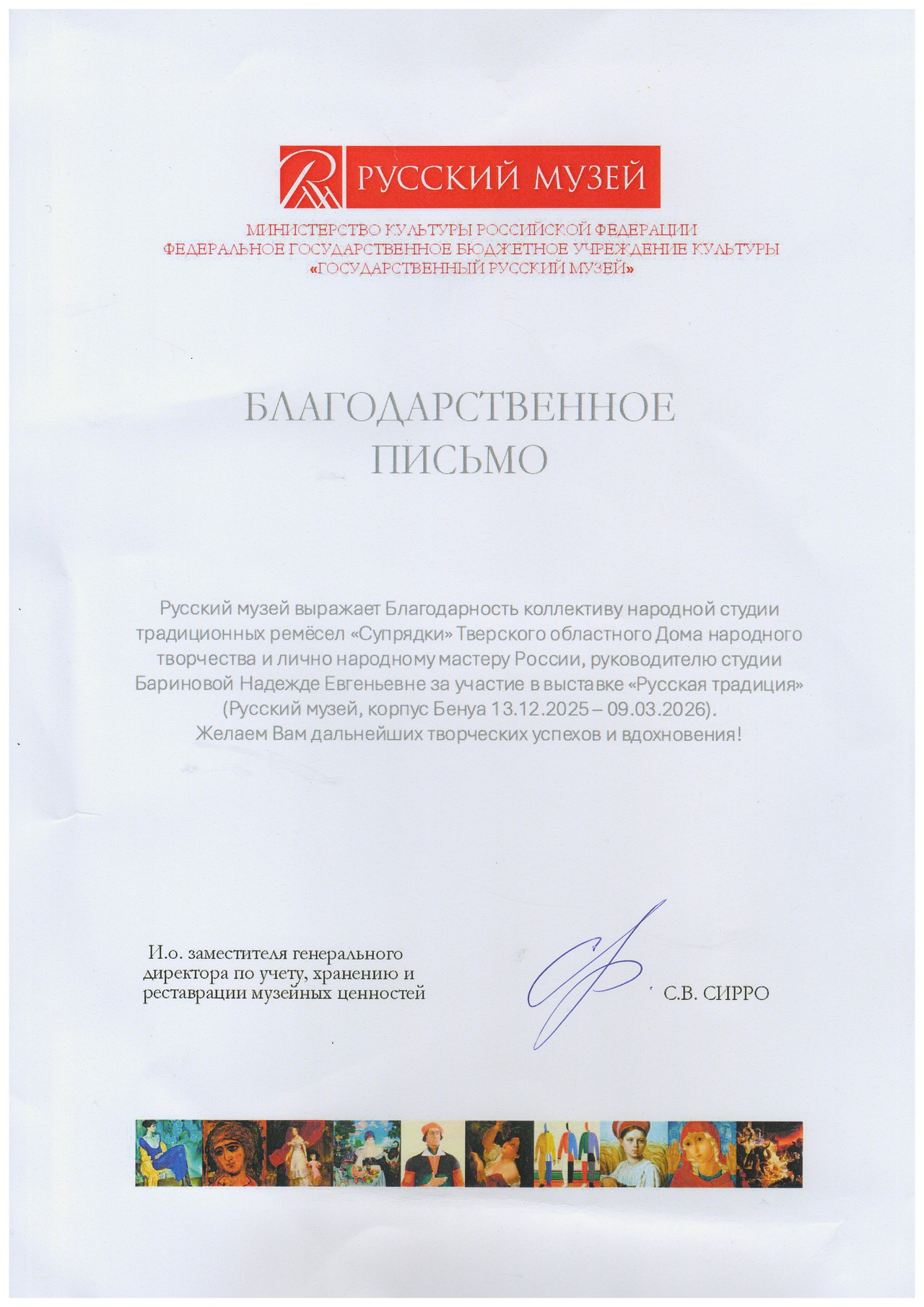 ✨ От Государственного Русского музея прозвучала благодарность народной студии традиционных ремесел «Супрядки» и её талантливому руководителю — Народному мастеру России Надежде Бариновой. Их творчество украсило выставку «Русская традиция», представив лучшее наследие нашего региона.