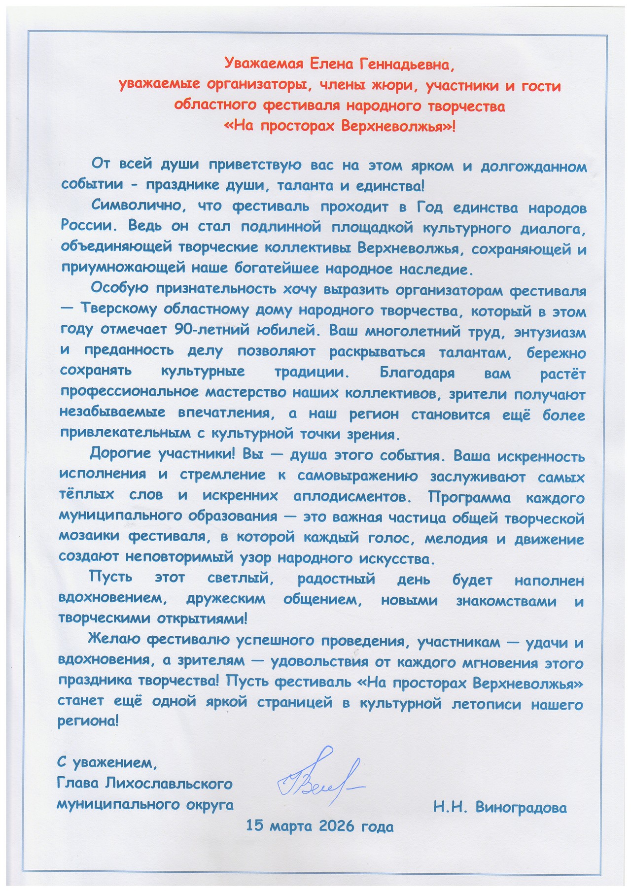 🎉 Теплые слова поддержки пришли из Лихославля: администрация Лихославльского муниципального округа, в лице Главы Натальи Николаевны Виноградовой тепло поблагодарила организаторов областного фестиваля народного творчества «На просторах Верхневолжья».