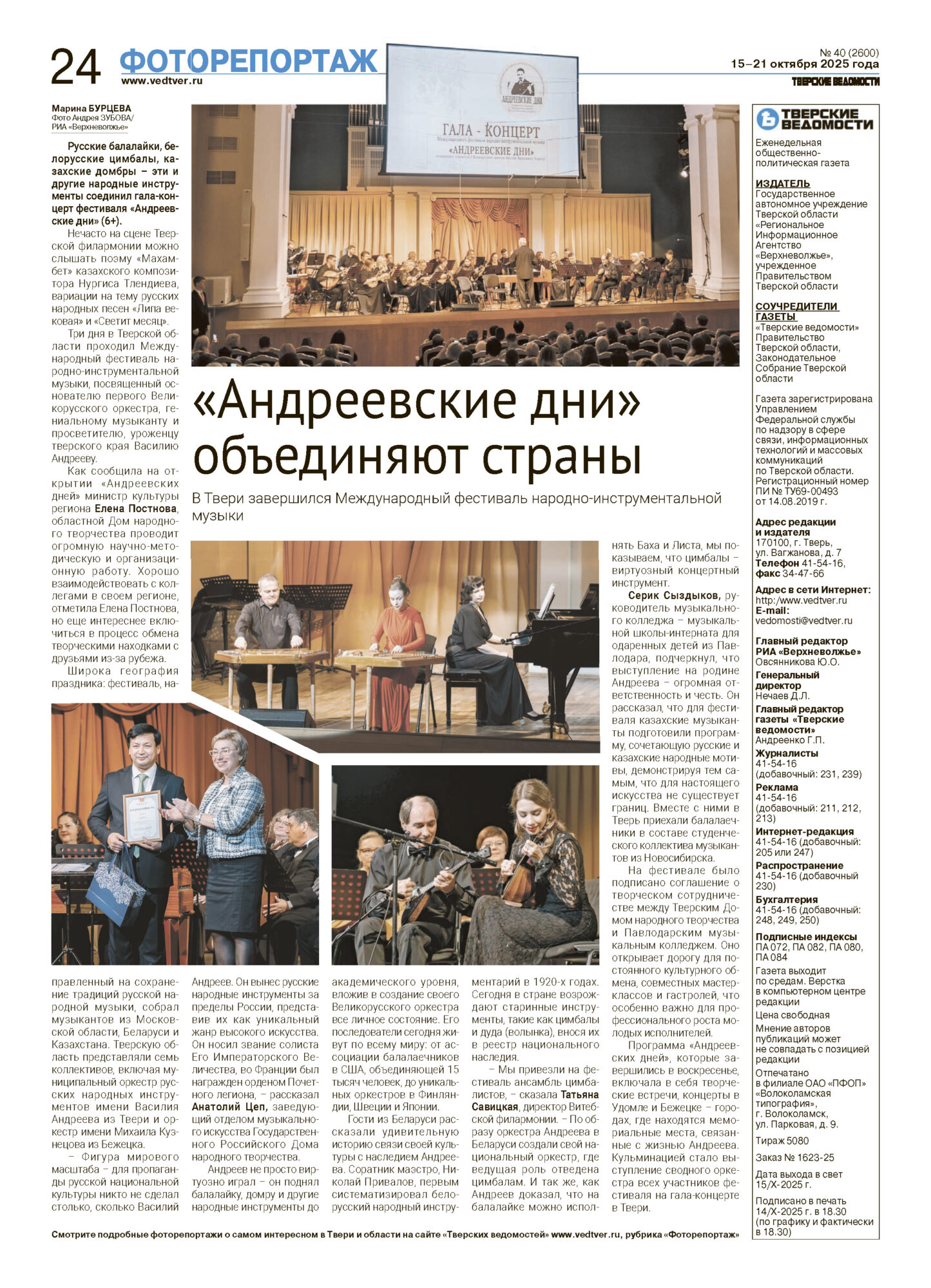 Предлагаем вашему вниманию фоторепортаж с международного фестиваля народно-инструментальной музыки «Андреевские дни», прошедшего с 10 по 12 октября 2025 года в Тверской области, в городах Тверь, Удомля и Бежецк.