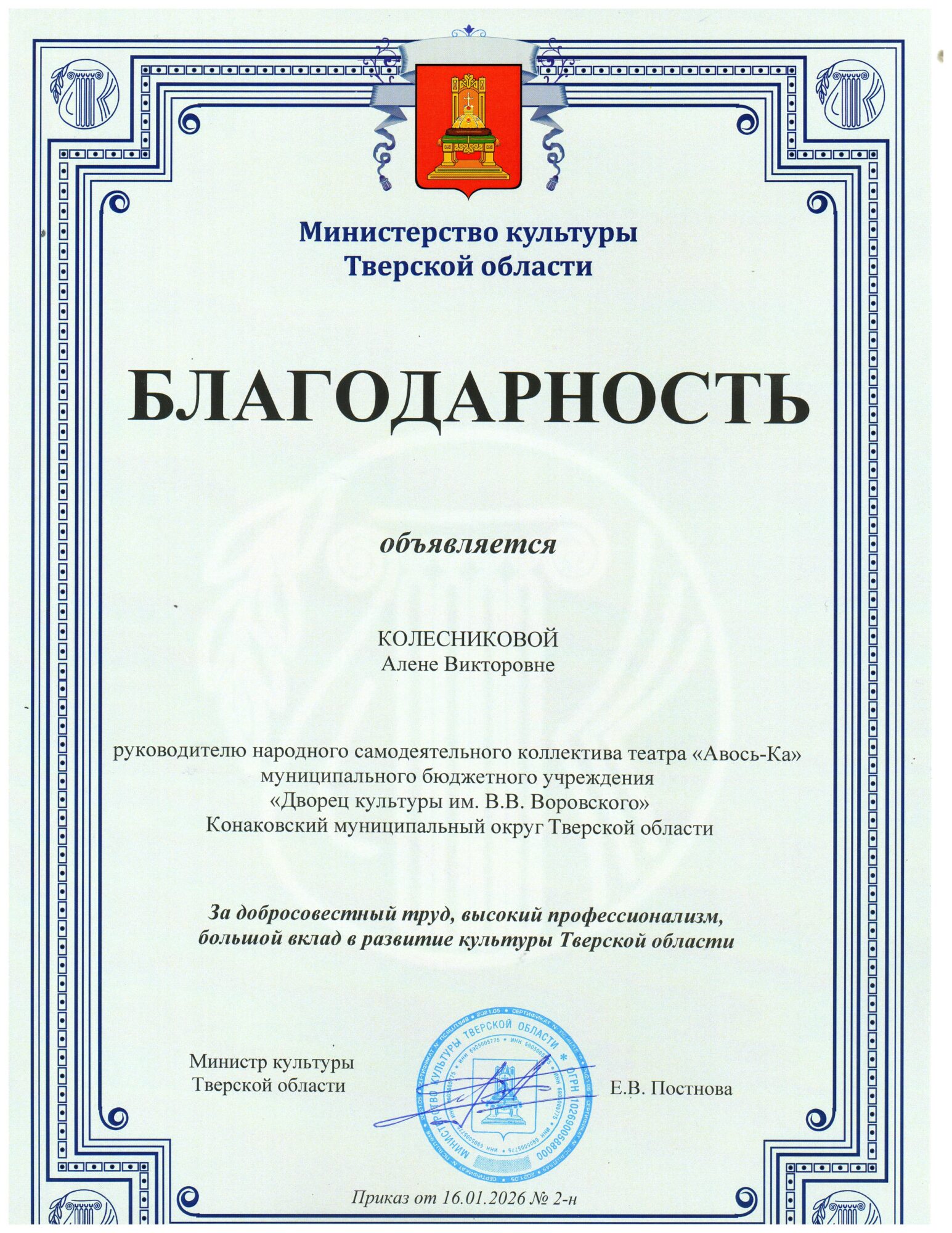 Уважаемые друзья! По случаю празднования Дня артиста Министерство культуры Тверской области отметило благодарностями и почетными грамотами руководителей творческих коллективов: