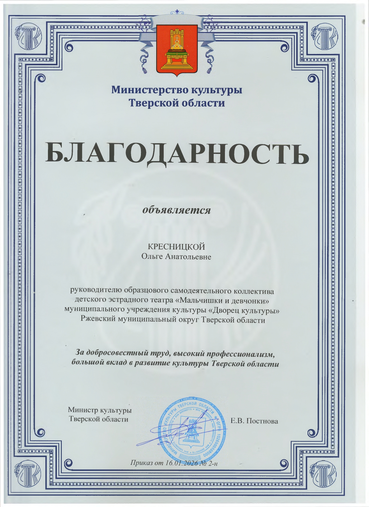 — Ольга Владимировна Кресницкая — руководитель образцового самодеятельного коллектива детского эстрадного театра «Мальчишки и девчонки» (МУК «Дворец культуры», Ржевский м/о);