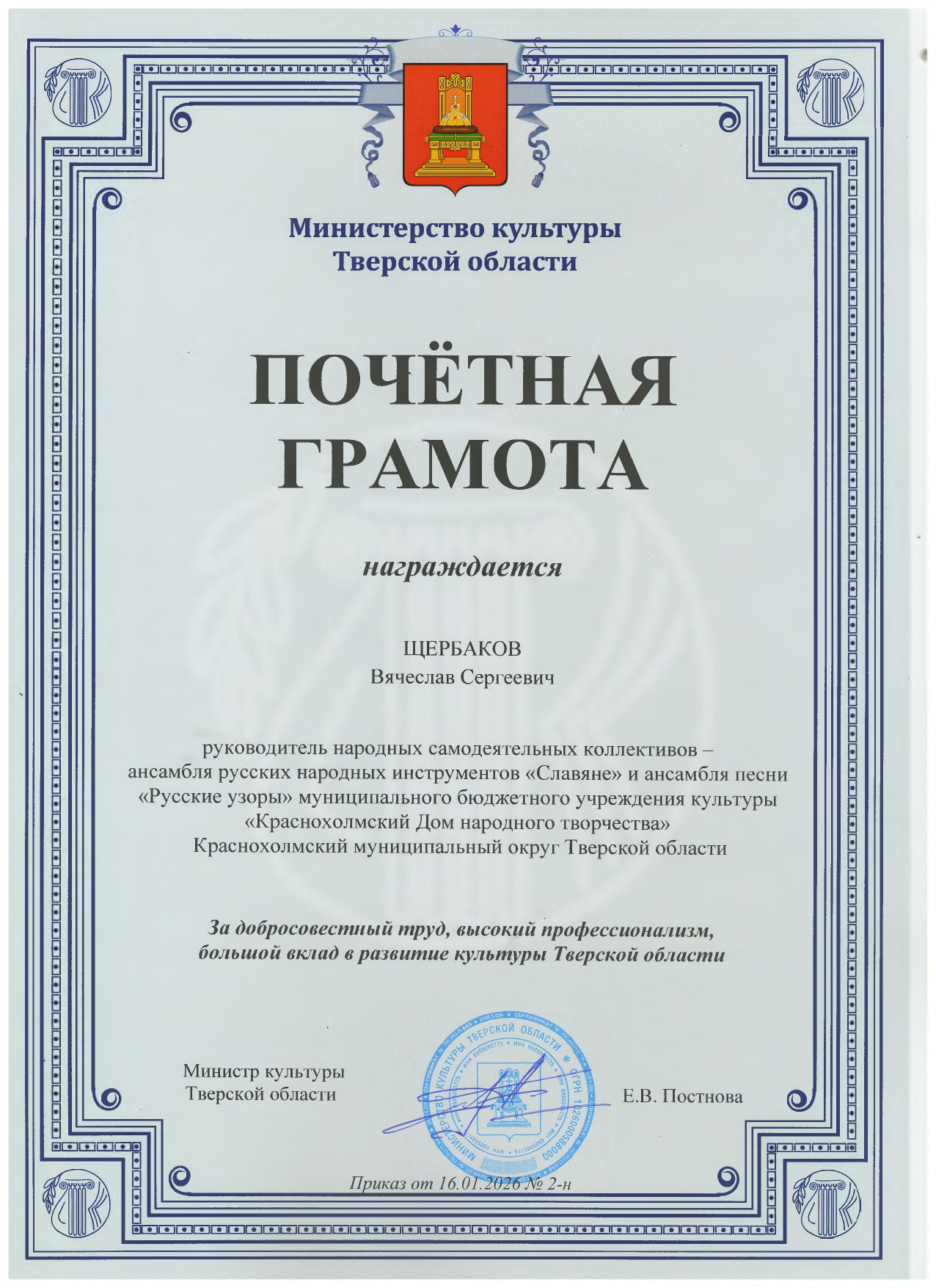 — Вячеслав Сергеевич Щербаков — руководитель народных самодеятельных коллективов — ансамбля русских народных инструментов «Славяне» и ансамбля песни «Русские узоры» (МБУК «Краснохолмский Дом культуры», Краснохолмский м/о)
