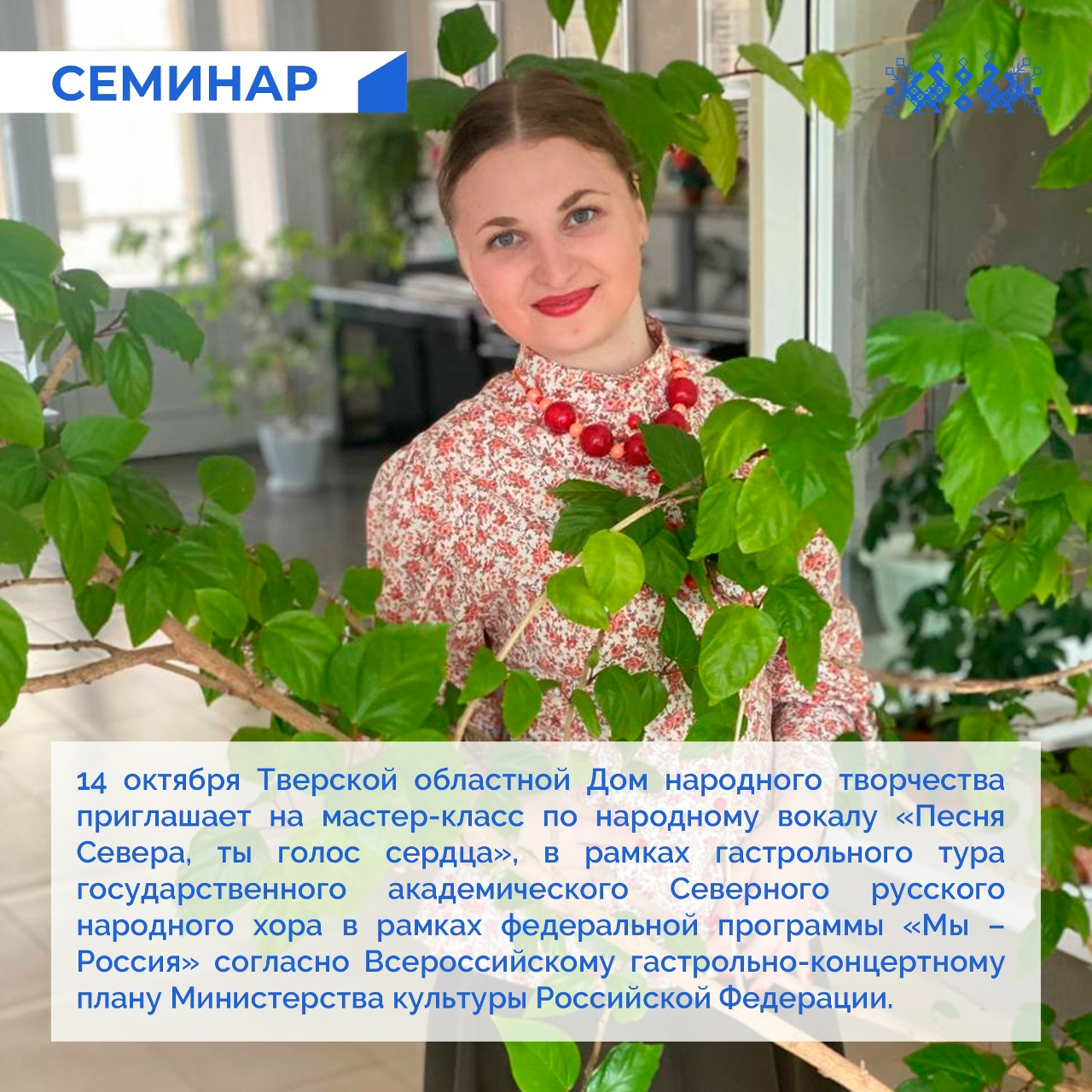14 октября Тверской областной Дом народного творчества приглашает на мастер-класс по народному вокалу «Песня Севера, ты голос сердца», в рамках гастрольного тура государственного академического Северного русского народного хора в рамках федеральной программы «Мы – Россия» согласно Всероссийскому гастрольно-концертному плану Министерства культуры Российской Федерации.