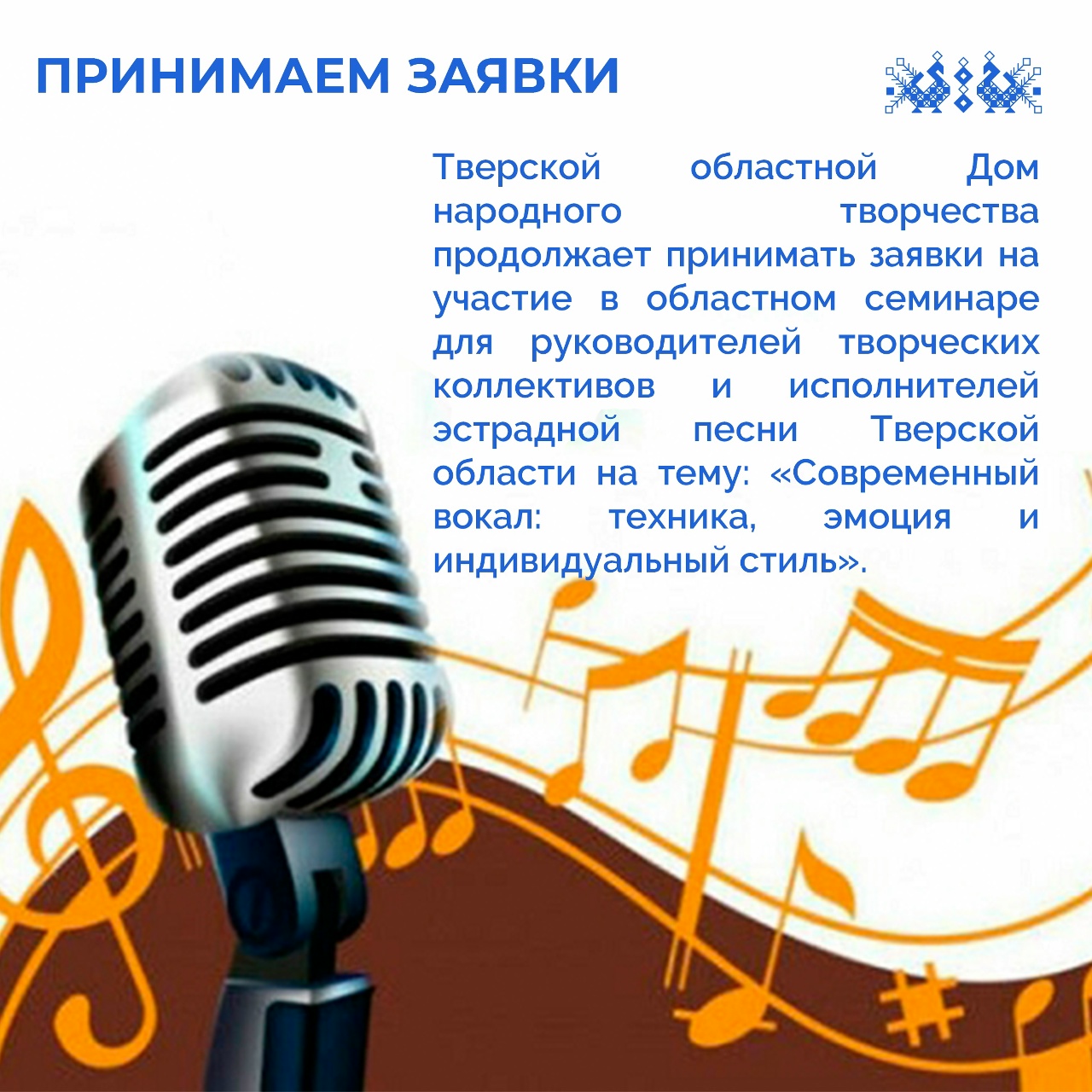 Тверской областной Дом народного творчества продолжает принимать заявки на участие в областном семинаре для руководителей творческих коллективов и исполнителей эстрадной песни Тверской области на тему: «Современный вокал: техника, эмоция и индивидуальный стиль».