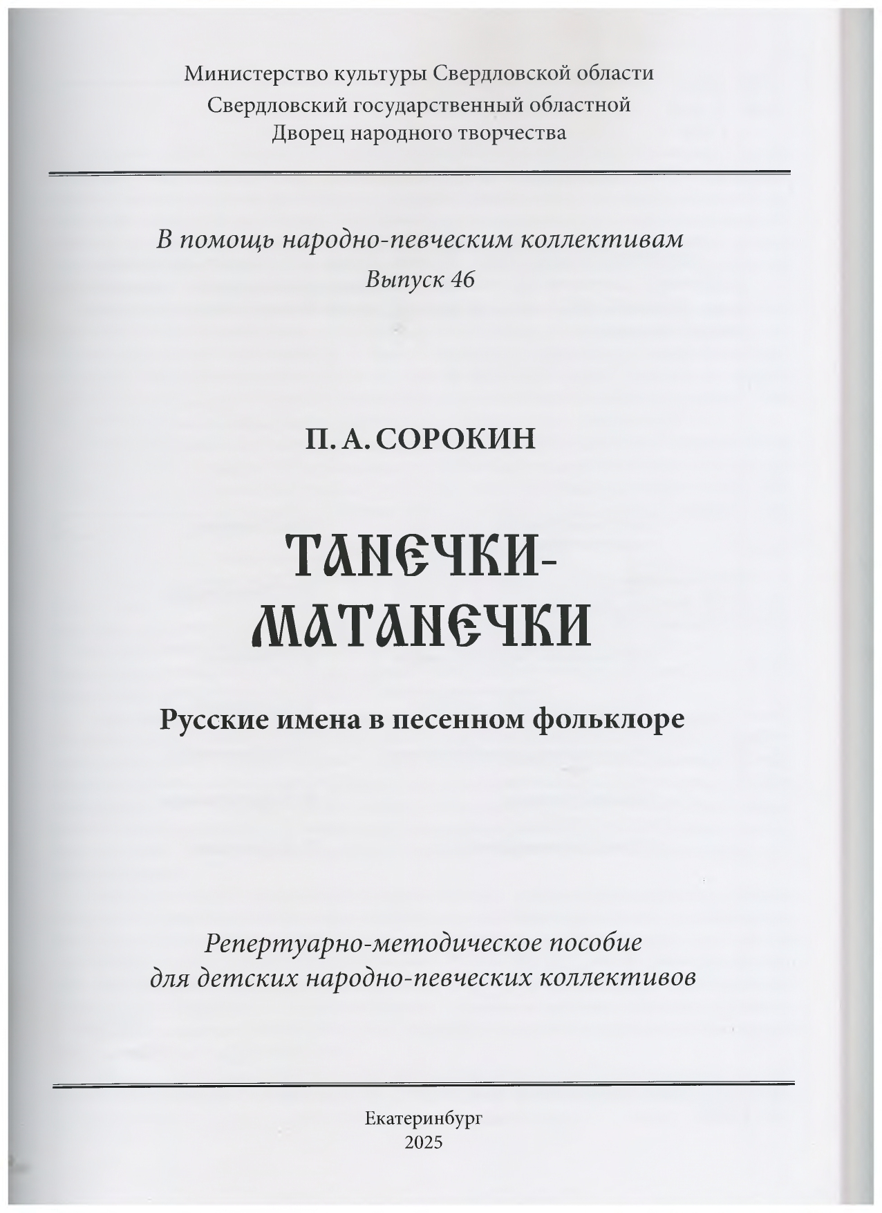 «Танечки-Матанечки» Русские имена в песенном фольклоре» репертуарно-методическое пособие для детских народно-певческих коллективов П.А. Сорокин