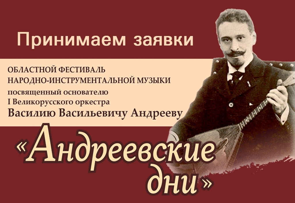 Тверской областной Дом народного творчества принимает заявки на участие в областном фестивале народно-инструментальной музыки «Андреевские дни», посвященном 165-летию основателя I Великорусского оркестра Василию Васильевичу Андрееву.