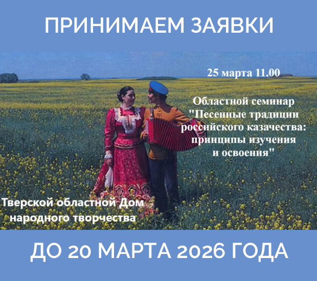 Тверской областной Дом народного творчества приглашает к участию в областном семинаре руководителей казачьих коллективов и коллективов, пропагандирующих казачью культуру Тема семинара — «Песенные традиции российского казачества: принципы изучения и освоения».