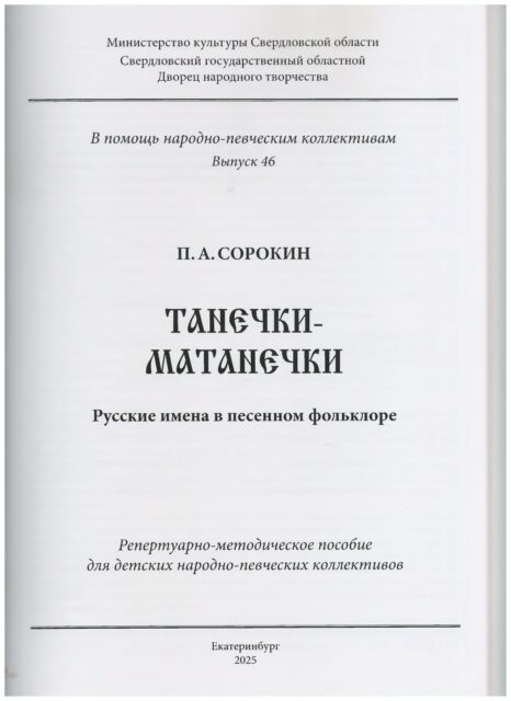 Предлагаем вашему вниманию репертуарно-методическое пособие «Танечки- Матанечки» Русские имена в песенном фольклоре» Петра Алексеевича Сорокина, Заслуженного артиста Российской Федерации, Лауреата премии Правительства Российской Федерации «Душа России», обладателя Знака отличия Министерства культуры Российской Федерации «Почетный наставник».